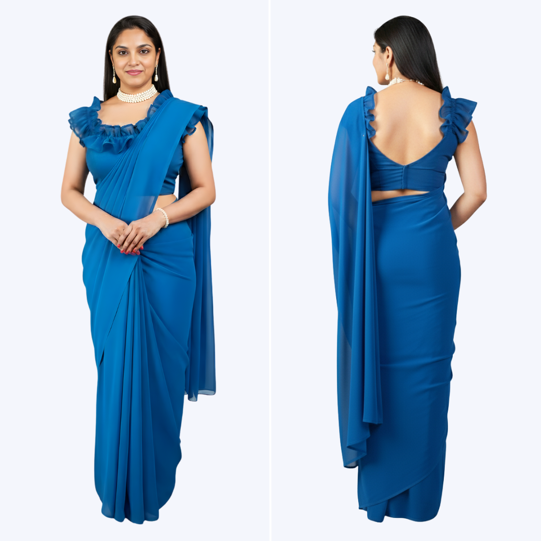 Melifloz Ruffle Neck Saree This pre-stitched, ready-to-wear saree offers a flawless, perfect drape in under a minute. The highlight is the chic, tailored blouse featuring dramatic ruffles around the neck and shoulders, complemented by a modern V-cut back. Crafted from a flowing, lightweight fabric, this striking saree is the ultimate formal attire for sophisticated events and occasions. Effortless style, maximum impact Manufacturer: Melifloz Availability: In stock Free shipping Color * Please select Teal Size * Please select Small (S) Medium (M) Large (L) Extra Large (XL) ₹1,000.00 Qty: Add to cart Custom wishlist OK Add to wishlist Add to compare list Product DescriptionElevate your formal wardrobe with the Melifloz Ruffle Neck Pre-Stitched Saree, a stunning ensemble that perfectly merges traditional grace with modern ease. Presented in a striking Teal color, this ready-to-wear saree is the epitome of sophisticated chic, designed for the contemporary woman who values both style and convenience.Key FeaturesReady-to-Wear Design: This is a pre-stitched, one-minute saree, eliminating the need for complex pleating and draping. Simply slip it on like a skirt and secure the pallu for a flawless, impeccably draped look every single time.Signature Ruffle Neck Blouse: The saree is paired with a beautifully tailored blouse featuring an eye-catching ruffle detail along the neck and shoulder line, adding a playful yet sophisticated dimension to the classic silhouette.Flattering Drape: Crafted from a lightweight, flowing fabric (Premium Georgette), the material cascades elegantly to create a sleek, slimming, and graceful silhouette.Modern Back Detailing: The blouse boasts a deep V-cut back, offering a contemporary and alluring twist to the traditional garment.Vibrant Color: The solid, Teal color is classic, commanding attention and serving as a perfect canvas for your favorite jewelry.Occasion DetailsThe Melifloz Ruffle Neck Saree is an ideal choice for formal and semi-formal occasions where you want to make a polished, memorable statement with minimal effort.Perfect For: Cocktail parties, evening receptions, corporate galas, upscale dinner events, wedding guest attire, and formal holiday gatherings.Styling Note: Its clean lines and sophisticated ruffle detail make it a versatile piece that can be paired with classic pearl accessories for timeless elegance or modern statement jewelry for a high-fashion look.