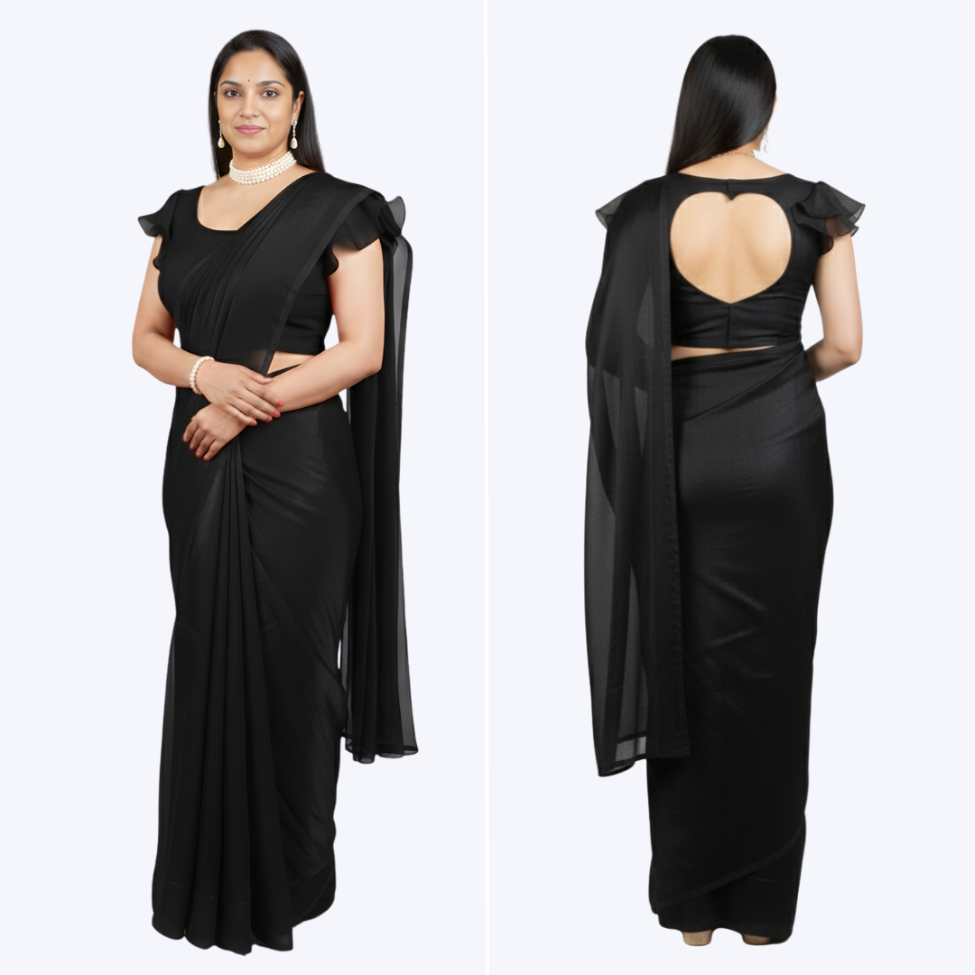 Melifloz Sweetheart Back Saree Featuring a red romantic sweetheart back cutout and frill sleeves, this Melifloz saree defines effortless modern glamour. Manufacturer: Alecstra Availability: In stock SKU: SP-100-SR-FS-A Color * Please select Rich Red Mustard Yellow Black Brown Size * Please select Small(S) Medium(M) Large(L) Extra Large(XL) ₹4,900.00 excluding shipping Qty: Add to cart Ship to Select country United States of America Afghanistan Åland Islands Albania Algeria American Samoa Andorra Angola Anguilla Antarctica Antigua and Barbuda Argentina Armenia Aruba Australia Austria Azerbaijan Bahamas Bahrain Bangladesh Barbados Belarus Belgium Belize Benin Bermuda Bhutan Bolivia (Plurinational State of) Bonaire, Sint Eustatius and Saba Bosnia and Herzegovina Botswana Bouvet Island Brazil British Indian Ocean Territory Brunei Darussalam Bulgaria Burkina Faso Burundi Cabo Verde Cambodia Cameroon Canada Cayman Islands Central African Republic Chad Chile China Christmas Island Cocos (Keeling) Islands Colombia Comoros Congo Congo (Democratic Republic of the) Cook Islands Costa Rica Côte d'Ivoire Croatia Cuba Curaçao Cyprus Czechia Denmark Djibouti Dominica Dominican Republic Ecuador Egypt El Salvador Equatorial Guinea Eritrea Estonia Eswatini Ethiopia Falkland Islands (Malvinas) Faroe Islands Fiji Finland France French Guiana French Polynesia French Southern Territories Gabon Gambia Georgia Germany Ghana Gibraltar Greece Greenland Grenada Guadeloupe Guam Guatemala Guernsey Guinea Guinea-Bissau Guyana Haiti Heard Island and McDonald Islands Holy See Honduras Hong Kong Hungary Iceland India Indonesia Iran (Islamic Republic of) Iraq Ireland Isle of Man Israel Italy Jamaica Japan Jersey Jordan Kazakhstan Kenya Kiribati Korea (Democratic People's Republic of) Korea (Republic of) Kuwait Kyrgyzstan Lao People's Democratic Republic Latvia Lebanon Lesotho Liberia Libya Liechtenstein Lithuania Luxembourg Macao Madagascar Malawi Malaysia Maldives Mali Malta Marshall Islands Martinique Mauritania Mauritius Mayotte Mexico Micronesia (Federated States of) Moldova (Republic of) Monaco Mongolia Montenegro Montserrat Morocco Mozambique Myanmar Namibia Nauru Nepal Netherlands New Caledonia New Zealand Nicaragua Niger Nigeria Niue Norfolk Island North Macedonia Northern Mariana Islands Norway Oman Pakistan Palau Palestine, State of Panama Papua New Guinea Paraguay Peru Philippines Pitcairn Poland Portugal Puerto Rico Qatar Réunion Romania Russian Federation Rwanda Saint Barthélemy Saint Helena, Ascension and Tristan da Cunha Saint Kitts and Nevis Saint Lucia Saint Martin (French part) Saint Pierre and Miquelon Saint Vincent and the Grenadines Samoa San Marino Sao Tome and Principe Saudi Arabia Senegal Serbia Seychelles Sierra Leone Singapore Sint Maarten (Dutch part) Slovakia Slovenia Solomon Islands Somalia South Africa South Georgia and the South Sandwich Islands South Sudan Spain Sri Lanka Sudan Suriname Svalbard and Jan Mayen Sweden Switzerland Syrian Arab Republic Taiwan, Province of China Tajikistan Tanzania, United Republic of Thailand Timor-Leste Togo Tokelau Tonga Trinidad and Tobago Tunisia Turkey Turkmenistan Turks and Caicos Islands Tuvalu Uganda Ukraine United Arab Emirates United Kingdom of Great Britain and Northern Ireland United States Minor Outlying Islands Uruguay Uzbekistan Vanuatu Venezuela (Bolivarian Republic of) Vietnam Virgin Islands (British) Virgin Islands (U.S.) Wallis and Futuna Western Sahara Yemen Zambia Zimbabwe * Other * Shipping Method Name Estimated Delivery Price No shipping options Apply Custom wishlist OK Add to wishlist Add to compare list Email a friend Product Description:Step into the spotlight with the Melifloz Sweetheart Back Saree, the ultimate statement piece that seamlessly merges timeless Indian heritage with romantic, modern allure. Designed for the woman who cherishes classic elegance but loves a contemporary detail, this stunning rich red saree is perfect for creating a memorable, sophisticated look.Key Features:Ready-to-Wear Convenience: This saree is pre-stitched and structured, Achieve a perfect, sophisticated drape every time in seconds.Sleeve Style: Ruffled Cap Sleeves: The bodice features delicate, sheer ruffled cap sleeves that add a touch of romantic volume and feminine charm, beautifully framing the upper body.Dress Length: Full-Length Grace: The garment flows into a traditional full-length silhouette, providing a tall and statuesque look that maintains the classic majesty of Indian ethnic wear.Saree Drape: This pre-stitched garment retains the timeless grace of the Nivi Drape's pallu, which flows dramatically over the shoulder, but pairs it with a modern, streamlined silhouette. Enjoy a show-stopping, traditional look with the effortless convenience of a contemporary dress.Lightweight Fandy Silk Fabric: Crafted from a premium Fandy Silk material, the saree boasts a soft, matte finish and a fluid drape, ensuring you remain comfortable and elegant throughout the event.Streamlined Silhouette: The main skirt section features a smooth, tailored fit that follows the natural line of the body, giving it a modern, confident, and sleek profile without compromising on comfort.Elegant Round Neckline: The sophisticated round neckline provides a classic and polished look, serving as an ideal backdrop for pearls or statement traditional jewelry.Occasion Details:This glamorous saree is perfectly suited for events that call for classic beauty with a touch of romantic modernity:Formal Events: Receptions, Red Carpet Events, and High-End Dinner Parties.Celebrations: Valentine's Day Events, Wedding Guest Attire, Festive Gatherings, and Anniversary PartiesSocial Gatherings: Romantic Date Nights, Engagement Parties, and Milestone Birthday Celebrations. Products specifications Attribute name Attribute value Saree Type Pre-Stitched Product tags saree (3) , fashion (3) , womenswear (3) Related products Melifloz Ruffle Neck Saree SP-100-SR-GT-A Ready-to-wear saree with 